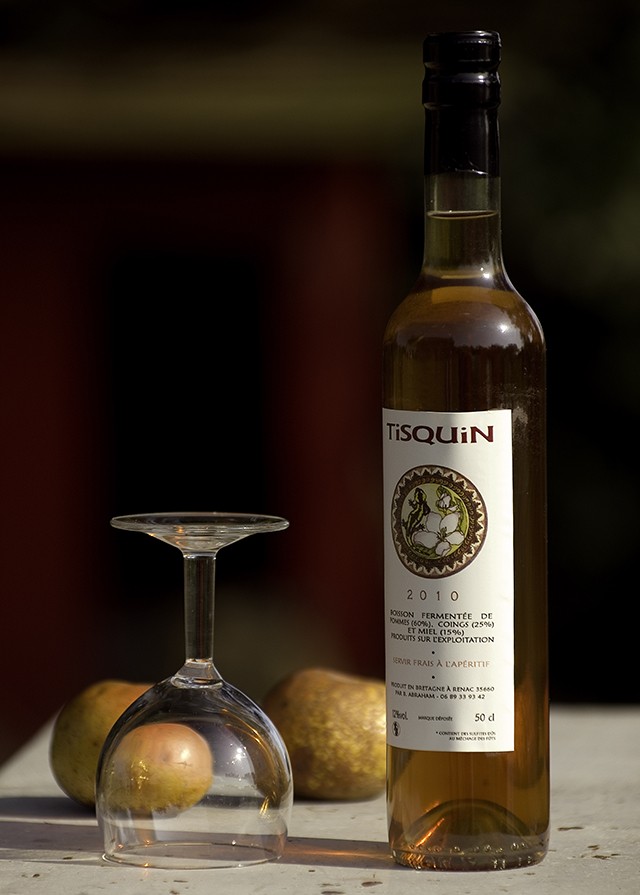 Tisquin, apéritif à base de pommes, coings & miel, vieillissement de 9 à 18 mois en barrique de chêne, pour le goût entre le cidre & le chouchenn, peu sucré & très fruité. Titre à 11-12 % vol. alc